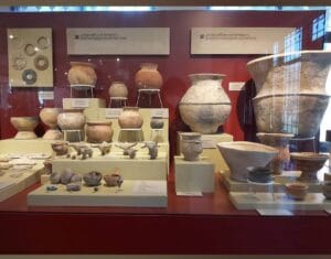 Le musée national de Ban Chiang, construit directement sur le site, est d’une grande intelligence muséographique. On ne t’y balance pas des vitrines froides. On t’explique la stratigraphie, les couches du temps, les méthodes de fouilles, les datations, les hypothèses. Tu marches littéralement au-dessus de l’histoire, certaines zones du sol sont vitrées, laissant voir les sépultures et les objets in situ. C’est sobre, clair, rigoureux, sans sensationnalisme. Du travail d’archéologue, pas du folklore touristique.